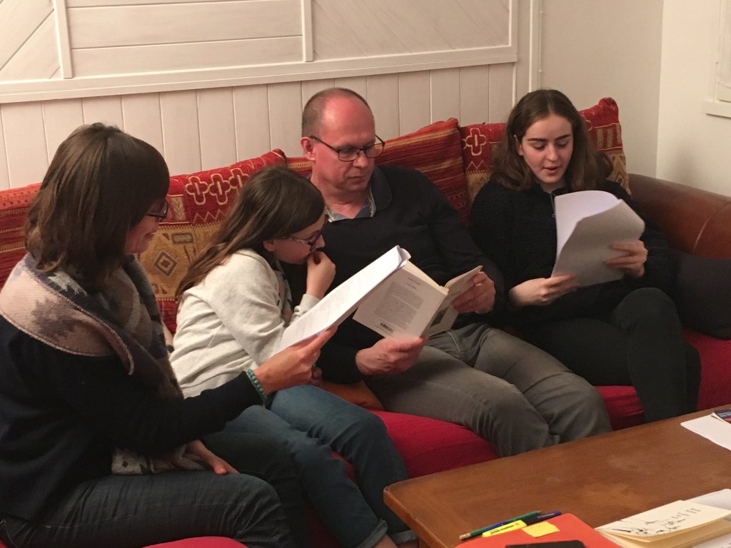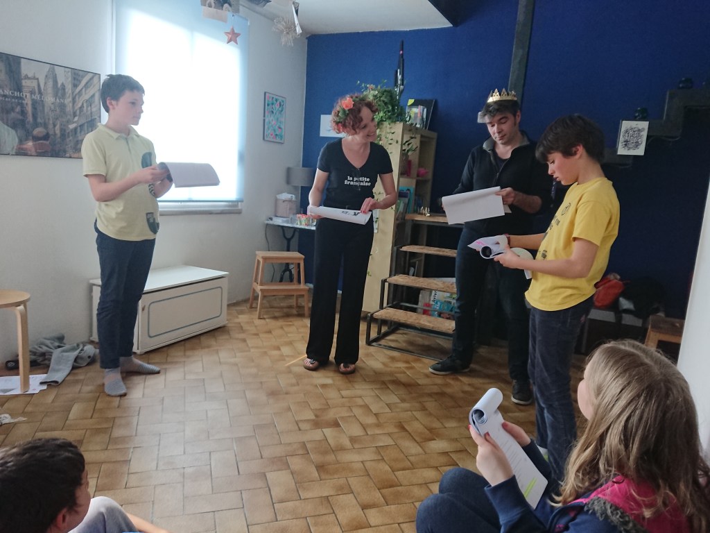 “La première famille a choisi de lire Les vilains petits de Catherine Verlaguet. Les filles ont, tout de suite, été séduites par le texte car il y avait la possibilité, pour chaque membre de la famille, de travailler un personnage. Tous les quatre se sont engagés dans l’aventure à cent pour cent. C’est le père qui les a inscrits à ce projet au départ. Dès le deuxième rendez-vous, surprise ! Celui-ci, avait imprimé une cinquantaine de feuilles A4 qui, mises bout à bout, reconstituaient une cour d’école. Ils m’ont proposé un décor représentant une classe avec un tableau et des petites chaises, et ont ressorti, pour l’occasion, leur sapin de Noël. Ils ont même préparé une bande sonore. »