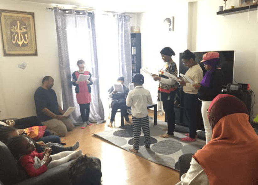 “Expérience car le cadre stricto sensu de la famille était bien plus large. Le dispositif peut vraiment être élargi à des groupes. Je suis intervenue auprès de jeunes réfugiés syriens, afghans et erythréens dans une école d’apprentissage du français. (…) Au vu du niveau de français et de compréhension, ils ont choisi Après grand c’est comment, de Claudine Galéa. La lecture s’est faite devant les autres étudiants de l’école. Je crois que tout le monde était content. Enfin, je suis intervenue dans un lieu d’accueil pour personnes fragiles économiquement et psychologiquement. On y sert des repas et différentes activités sont organisées. Le nombre des participant.e.s a varié entre 6 et 9 en fonction des séances. Les suffrages sont allés à Alice pour le moment de Sylvain Levey et la lecture était vraiment très belle. Il y avait une sacrée énergie et je pense que tout le monde a apprécié. La représentation s’est déroulée devant d’autres habitués du lieu.”
