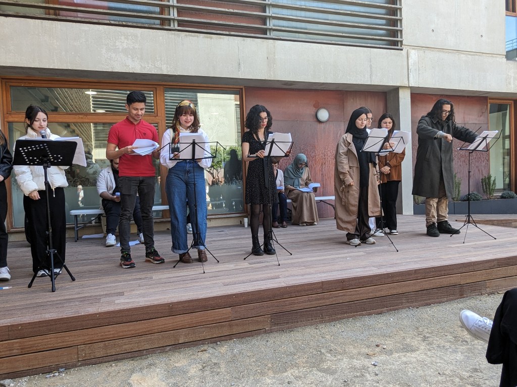 Les étudiant·es, pleinement investi·es dans cette lecture, ont pris un plaisir évident tout au long de l’atelier et ont restitué avec beaucoup d’intelligence et d’humour la portée critique et comique du texte de Julien Guyomard. En parallèle de l’atelier, les étudiant·es ont pu assister à deux spectacles : « Nos révoltes », mis en scène par Muriel Sapinho et « Welfare », mis en scène par Julie Deliquet, auxquels iels ont assisté le soir même après leur lecture. Cette expérience a été très enrichissante pour toutes et tous. Elle leur a permis d’être à la fois acteur·rices et spectateur·rices. Iels ont en particulier pu s’approprier un texte de théâtre contemporain, en saisir toute la portée théâtrale et sociologique, prendre plaisir à lire et dire ce texte jusqu’à le porter et le donner à écouter à un public composé d’étudiant·es, d’enseignant·es, de personnels de l’université et de quelques proches. Iels ont également pris confiance en eux et elles, montré qu’iels étaient en mesure de s’exposer et de jouer face à un public. Ces moments partagés ont par ailleurs contribué à souder le groupe et participé à une meilleure connaissance des un·es et des autres.